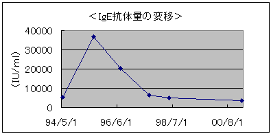<上の表の説明> 初診時にはIgE抗体はすでに5286と非常に高値を示していました。ステロイド離脱により、6倍以上に増え、この間激しい離脱症状を経験されたわけであります。勿論、抗体の上昇や下降は決して一直線ではありません。その間上がったり下がったりして最後はどんどん減っていくわけです。治癒期に再び一時的に高く上昇することが見られますが(勿論最高値を超えることはありませんが)、それは過去の一時期に強いステロイドを使って強く抑制したためであります。最近値の4990は初期値の5286に近いのでありますが、アトピーの状態は全く雲泥の差があります。従ってIgE抗体の絶対値だけでアトピー全体を論ずることが出来なくなったのは、まさにステロイドを使ったが為であります。ステロイドさえ使わなければ、IgE抗体は絶対にこんなに高値をとることはないのです。 |